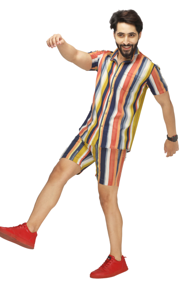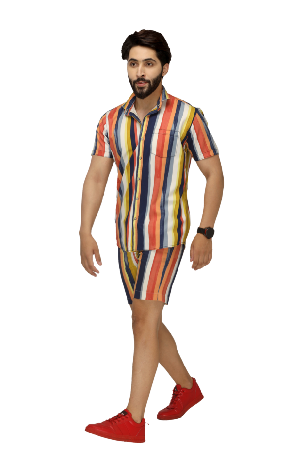 Enjoy the holidays in style with this blue yellow and white striped co-ord set. These multi colour with white striped co-ords for men are made from a lightweight twill rayon fabric that will keep you cool and comfortable to move around in.